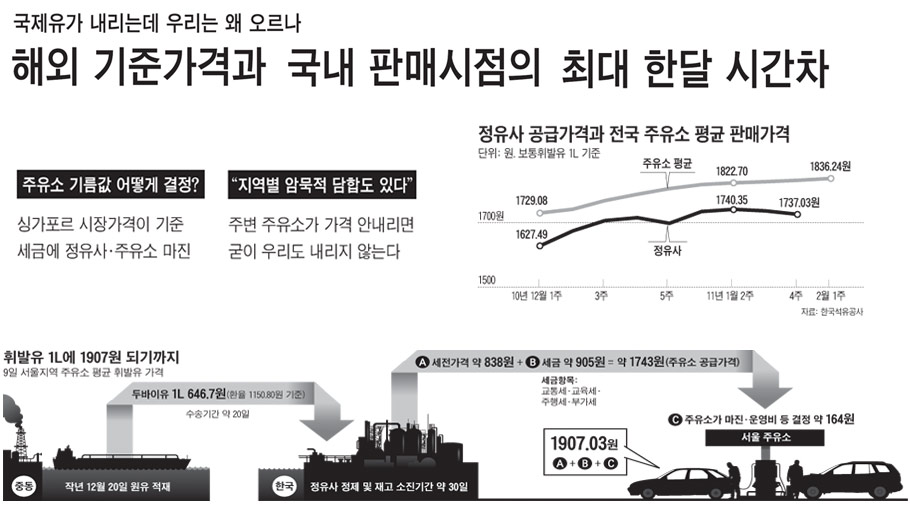 ÈÖ¹ßÀ¯ 5¸¸¿ø¾îÄ¡¸¦ ÁÖÀ¯ÇÑ È¸»ç¿ø ±è¸ð(43)¾¾´Â "±¹Á¦ À¯°¡´Â Ç϶ô¼¼¶ó´Âµ¥, ÈÖ¹ßÀ¯ °ªÀº ¿Ö °Å²Ù·Î ¿À¸£´ÂÁö ¸ð¸£°Ú´Ù"°í ¸»Çß´Ù. ÀÌ Á¤µµ¸é "±â¸§°ªÀÌ ¹¦ÇÏ´Ù"°í ÇÒ ¸¸ÇÏ´Ù. ¿Ã µé¾î ±¹Á¦À¯°¡(µÎ¹ÙÀÌÀ¯)´Â Áö³ 2ÀÏ ¹è·²´ç 97.11´Þ·¯·Î Á¤Á¡À» ÂïÀº ÈÄ Ç϶ô¼¼·Î µ¹¾Æ¼, 8ÀÏ¿¡´Â 96.07´Þ·¯¸¦ ±â·ÏÇß´Ù. Á¤À¯»ç°¡ ÁÖÀ¯¼Ò¿¡ °ø±ÞÇÏ´Â ÈÖ¹ßÀ¯ °¡°Ýµµ Áö³ 1¿ù µÑ° ÁÖ L´ç 1740.35¿øÀ» ±â·ÏÇÑ ÈÄ 2ÁÖ ¿¬¼Ó ³»·È´Ù. ÇÏÁö¸¸ ÁÖÀ¯¼Ò ÆÇ¸Å°¡°ÝÀº Áö³ÇØ 10¿ù ù ÁÖ ÀÌÈÄ 18ÁÖ ¿¬¼Ó »ó½Â¼¼´Ù. ÀÌ ¶§¹®¿¡ À±ÁõÇö ±âȹÀçÁ¤ºÎ Àå°üÀº 9ÀÏ °æÁ¦Á¤Ã¥Á¶Á¤È¸ÀÇ¿¡¼ "¼®À¯·ù °¡°Ý °áÁ¤ Åõ¸í¼º¿¡ ´ëÇÑ ÀDZ¸½É ÇØ¼Ò°¡ Àý´ëÀûÀ¸·Î ÇÊ¿äÇÏ´Ù"¸ç "Á¤À¯¿Í Åë½Å»ê¾÷ µî µ¶°úÁ¡Àû ¼º°ÝÀÌ °ÇÑ »ê¾÷ÀÇ °æÀï È®»êÀ» À§ÇØ ½ÃÀ屸Á¶ °³¼± ¹æ¾ÈÀ» Àû±ØÀûÀ¸·Î °ËÅäÇØ¾ß ÇÑ´Ù"°í °Á¶Çß´Ù. ¢º ±â»ç ´õ ÀÚ¼¼È÷ º¸±â
