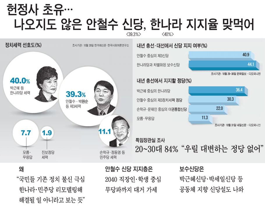 ¡ã ÃÖ±Ù ½Ç½ÃµÈ °¢Á¾ ¿©·ÐÁ¶»ç¿¡¼ ÀÀ´äÀÚÀÇ 40%°¡·®ÀÌ ¾Èö¼ö ¼¿ï´ë À¶ÇÕ°úÇбâ¼ú´ëÇпøÀå°ú ¹Ú¿ø¼ø ¼¿ï½ÃÀå Áß½ÉÀÇ Á¦3½Å´çÀÌ ÃâÇöÇÒ °æ¿ì "ÁöÁöÇϰڴÙ"°í ´äÇϰí ÀÖ´Ù. ÇöÀç Á¤Ä¡±Ç¿¡¼± ¾ß±Ç ÅëÇÕ Â÷¿øÀÇ ½Å´ç ³íÀÇ´Â ÀÖÀ¸³ª, Á¦3¼¼·ÂÀÇ ½Å´ç ³íÀÇ´Â ½ÃÀÛµÇÁöµµ ¾Ê¾Ò´Ù. ±×·±µ¥µµ ¿©·ÐÁ¶»ç¿¡¼± ½Çüµµ ºÐ¸íÄ¡ ¾ÊÀº 'Á¦3½Å´ç'ÀÌ ±¹È¸ °ú¹Ý ÀǼ®À» Â÷ÁöÇÏ´Â Á¦1´ç Çѳª¶ó´ç°ú ÇÊÀûÇÏ´Â ÁöÁöµµ¸¦ ¹Þ°í ÀÖ´Ù. ¿ì¸® ÇåÁ¤»ç(úÊïÙÞÈ)¿¡¼ À¯·Ê°¡ ¾ø´Â ÀÏÀÌ´Ù. ¢º ±â»ç ´õ ÀÚ¼¼È÷ º¸±â