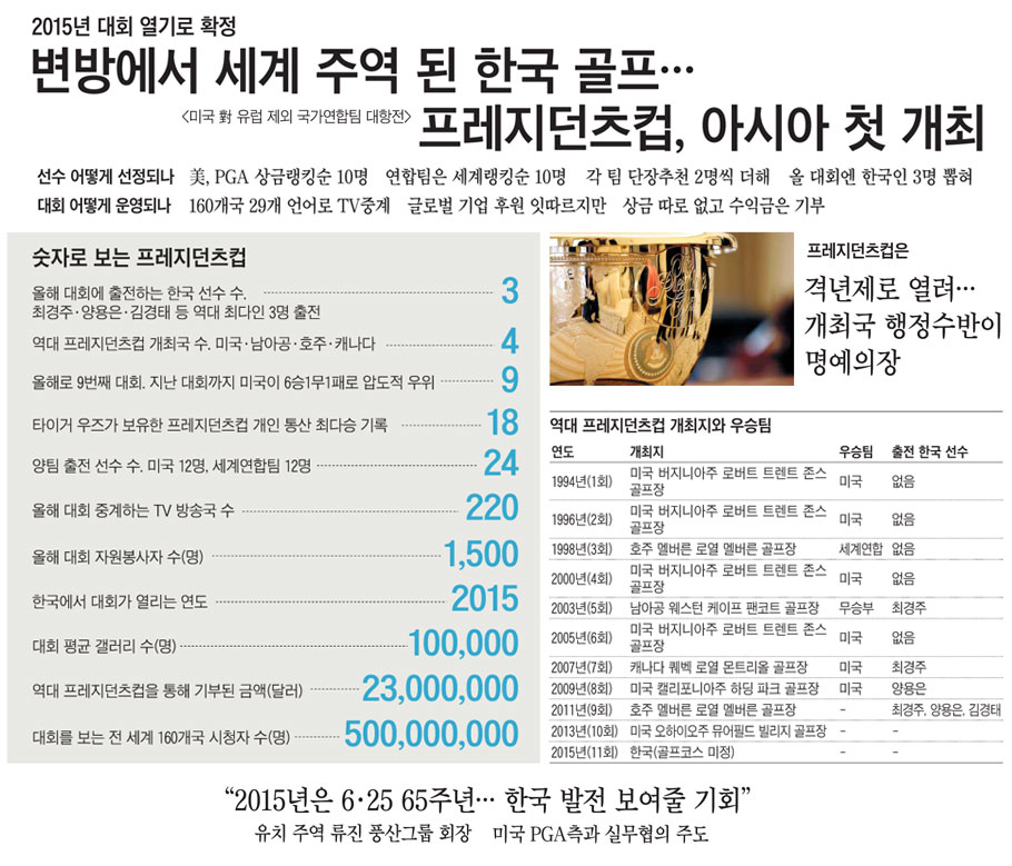 À̹ø¿¡´Â ÃÖ°æÁÖ¿Í ¾ç¿ëÀº, ¹Ú¼¼¸®¿Í ÃÖ³ª¿¬ µî ¸¹Àº ¼±¼öµéÀÌ °¢Á¾ ±¹Á¦ ¹«´ë¿¡¼ ¶Ù¾î³ ¼ºÀûÀ» ¿Ã¸®¸ç Çѱ¹ÀÇ ´ëÇ¥ Á¾¸ñÀ¸·Î ¼ºÀåÇÑ °ñÇÁ´Ù. ÆÀ ÇÉ÷ ¹Ì±¹ÇÁ·Î°ñÇÁ(PGA) Åõ¾î Ä¿¹Ì¼Å³Ê´Â 16ÀÏ È£ÁÖ ¸á¹ö¸¥¿¡¼ ¿¸° 2011 ÇÁ·¹Áö´øÃ÷ÄÅ(The Presidents Cup) °ñÇÁ´ëȸ °³È¸½ÄÀ» ¸¶Ä£ µÚ Ưº° ±âÀÚȸ°ßÀ» ¿¾î "2015³â ÇÁ·¹Áö´øÃ÷ÄÅ ´ëȸ¸¦ Çѱ¹¿¡¼ ¿±â·Î Çß´Ù"°í ¹ßÇ¥Çß´Ù. ±âÀÚȸ°ß¿¡´Â À̹ø ´ëȸ¿¡ ÃâÀüÇÏ´Â ÃÖ°æÁÖ¿Í ¾ç¿ëÀº, ±è°æÅµµ ÀÚ¸®¸¦ ÇÔ²²Çß´Ù. ¢º ±â»ç ´õ ÀÚ¼¼È÷ º¸±â