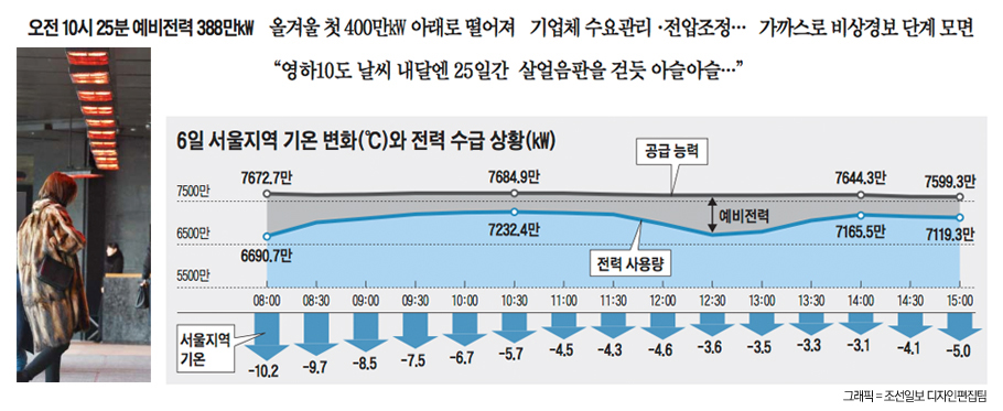 ¡ã 6ÀÏ ¿ÀÀü 10½Ã 25ºÐ ¼¿ï °³²±¸ »ï¼ºµ¿ Çѱ¹Àü·Â°Å·¡¼Ò ºñ»ó´ëÃ¥»óȲ½Ç. ¸ð´ÏÅÍ¿¡ ³ªÅ¸³ ¿¹ºñÀü·ÂÀÌ 388¸¸§Ò¿´´Ù. ¼¿ï ¾ÆÄ§ ÃÖÀú ±â¿ÂÀÌ ¿µÇÏ 10µµ±îÁö ¶³¾îÁö¸é¼ Àü·Â ¼ö¿ä°¡ ±ÞÁõÇ߱⠶§¹®ÀÌ´Ù. ¢º ±â»ç ´õ ÀÚ¼¼È÷ º¸±â