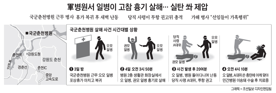 ¡ã ±¹±ºÃáõº´¿ø¿¡¼ º´»ç°¡ ¼±ÀÓº´À» Èä±â·Î Âñ·¯ »ìÇØÇÑ »ç°ÇÀÌ ¹ß»ýÇß´Ù. °¡ÇØ º´»ç´Â »ç°í ÈÄ¿¡µµ ³µ¿À» ºÎ¸®´Ù Àå±³°¡ ½ð ÃÑ¿¡ ¸Â°í ºÙÀâÇû´Ù. ±º(ÏÚ)Àº ¼±¡¤ÈÄÀÓº´ »çÀÌÀÇ °¡È¤ÇàÀ§°¡ »ç°ÇÀÇ ¿øÀÎÀÏ °¡´É¼ºÀ» ¿°µÎ¿¡ µÎ°í Á¶»ç¸¦ ÁøÇà ÁßÀÌ´Ù. ¢º ±â»ç ´õ ÀÚ¼¼È÷ º¸±â