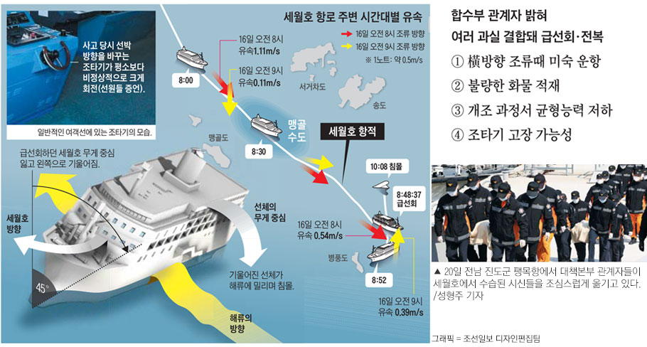 ¡ã ¼¼¿ùÈ£ Âü»ç´Â ¹è°¡ ¹æÇâÀ» ±Þ°ÝÇÏ°Ô ¿ìȸÇÏ¸é¼ ½ÃÀ۵ƴÙ. »ç°í ´çÀÏ ¿ÀÀü 8½Ã 48ºÐÂë ¼¼¿ùÈ£´Â Á¶Å¸±â¸¦ ÃÖ´ë Ÿ°¢(35µµ)À¸·Î µ¹¸± Á¤µµÀÇ ±Þ¼±È¸¸¦ ÇßÀ¸¸ç ÀÌÈÄ Áß½ÉÀ» ÀÒÀº °ÍÀ¸·Î ¾Ë·ÁÁ³´Ù. Àü¹®°¡µéÀº ¼¼¿ùÈ£°¡ ¸Í°ñ¼öµµ(ØëÍéâ©Ô³)¸¦ Áö³ª Á¦ÁÖµµ·Î °¡·Á¸é Á¶Å¸¸¦ ¿À¸¥ÂÊÀ¸·Î 5µµ¸¸ µ¹¸®¸é µÈ´Ù°í ¼³¸íÇÑ´Ù. ¢º ±â»ç ´õ ÀÚ¼¼È÷ º¸±â