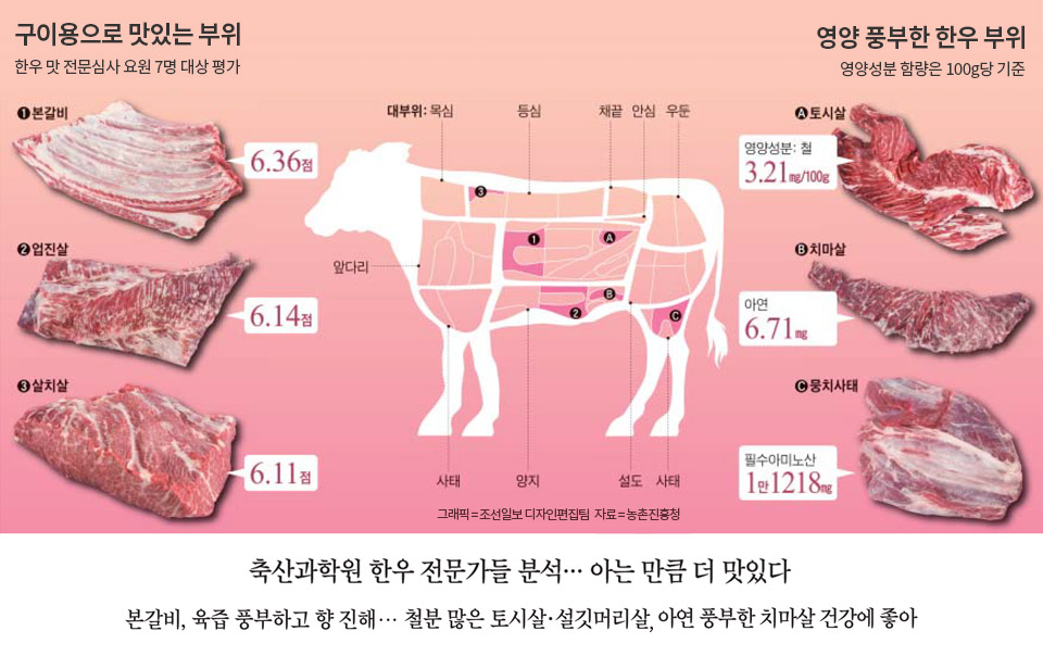 ¡ã 30¿© °³ ÇÑ¿ì(ùÛéÚ) ºÎÀ§ Áß ±¸¿ö ¸ÔÀ» ¶§ °¡Àå ¸ÀÀÖ´Â ºÎÀ§·Î Àü¹®°¡µéÀº 'º»°¥ºñ'¸¦ ²Å¾Ò´Ù. ¼Ò´Â 13°³ÀÇ °¥ºñ»À°¡ Àִµ¥, º»°¥ºñ´Â Á¦1 °¥ºñ»À¿¡¼ Á¦5 °¥ºñ»À¸¦ ºÐ¸®ÇØ ´ÙµëÀº °ÍÀÌ´Ù. ¹¶Ä¡»çÅ¡¤¿ìµÐ»ì(Çʼö¾Æ¹Ì³ë»ê), Åä½Ã»ì(ö), Ä¡¸¶»ì(¾Æ¿¬) µî¿¡´Â °¢Á¾ ¿µ¾çÀÌ Ç³ºÎÇÑ °ÍÀ¸·Î ³ªÅ¸³µ´Ù. ¢º ±â»ç ´õ ÀÚ¼¼È÷ º¸±â